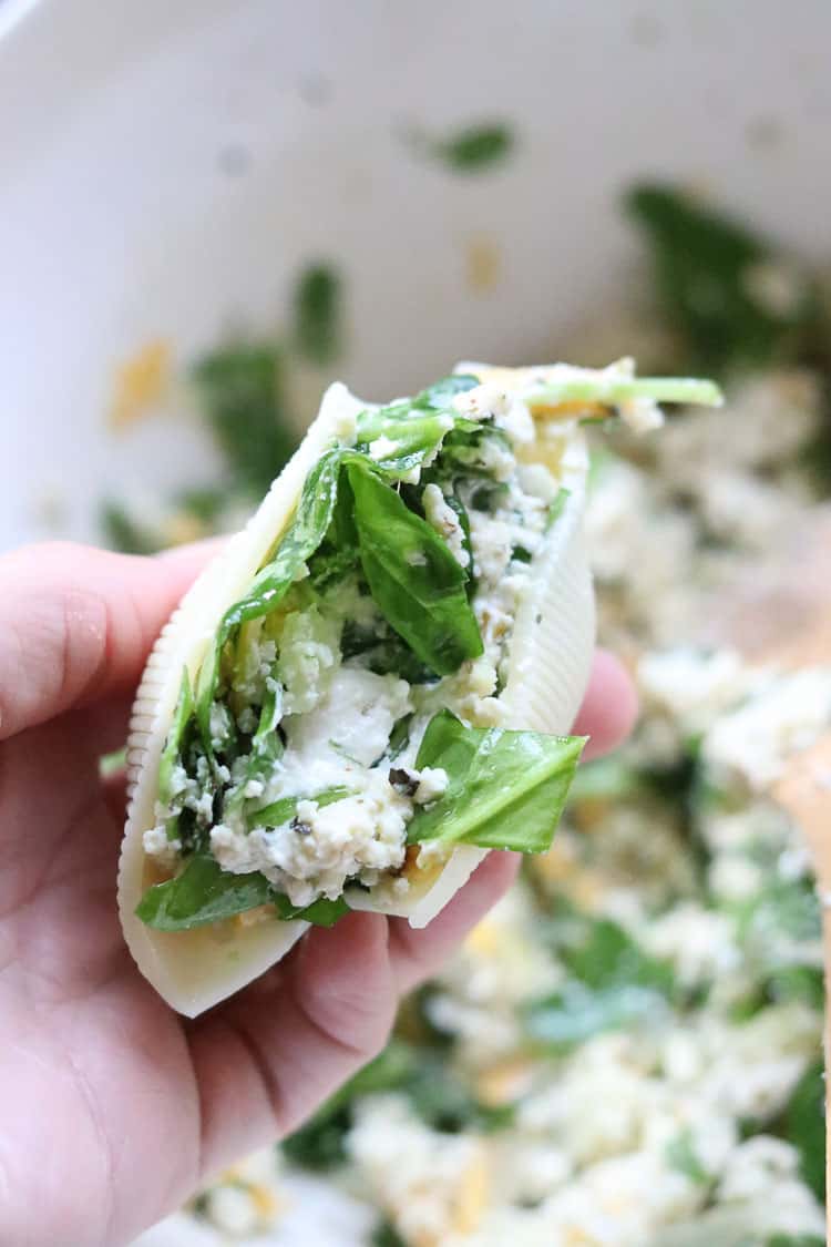Grab your pre-cooked stuffed shells (you'll need 18-20) and using a tablespoon place around 2 heaping tablespoons of the tofu-ricotta filling mixture into each shell.
