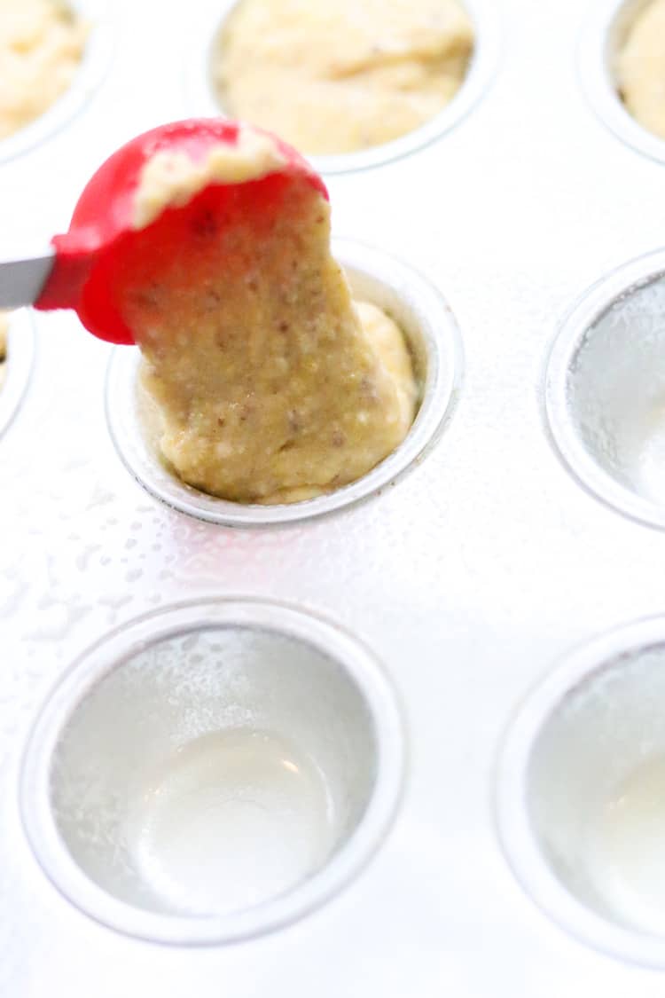 Now spoon a heaping tablespoon full of batter into each mini-muffin spot.