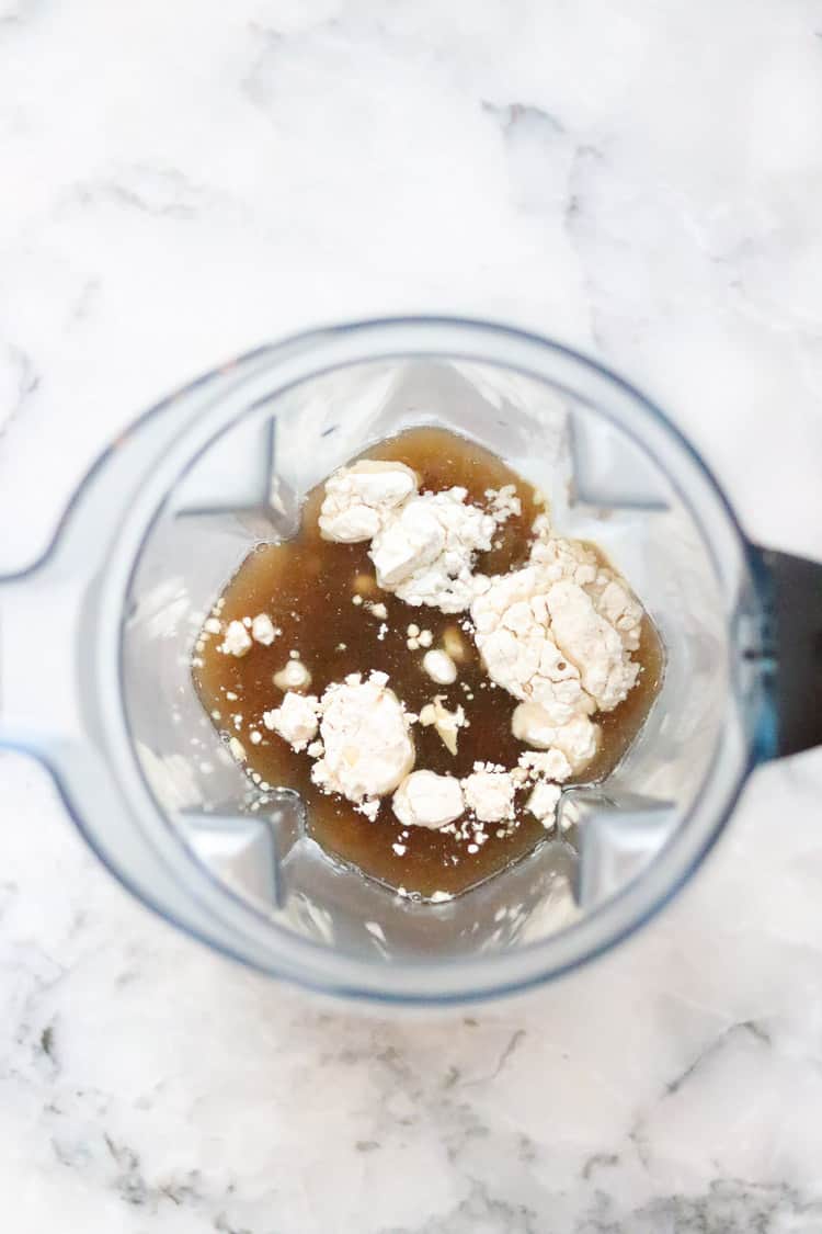 First, gather all your ingredients (cashews, liquid aminos, onion powder, garlic powder, salt, and flour or cornstarch) and place them in the blender with one cup of water.