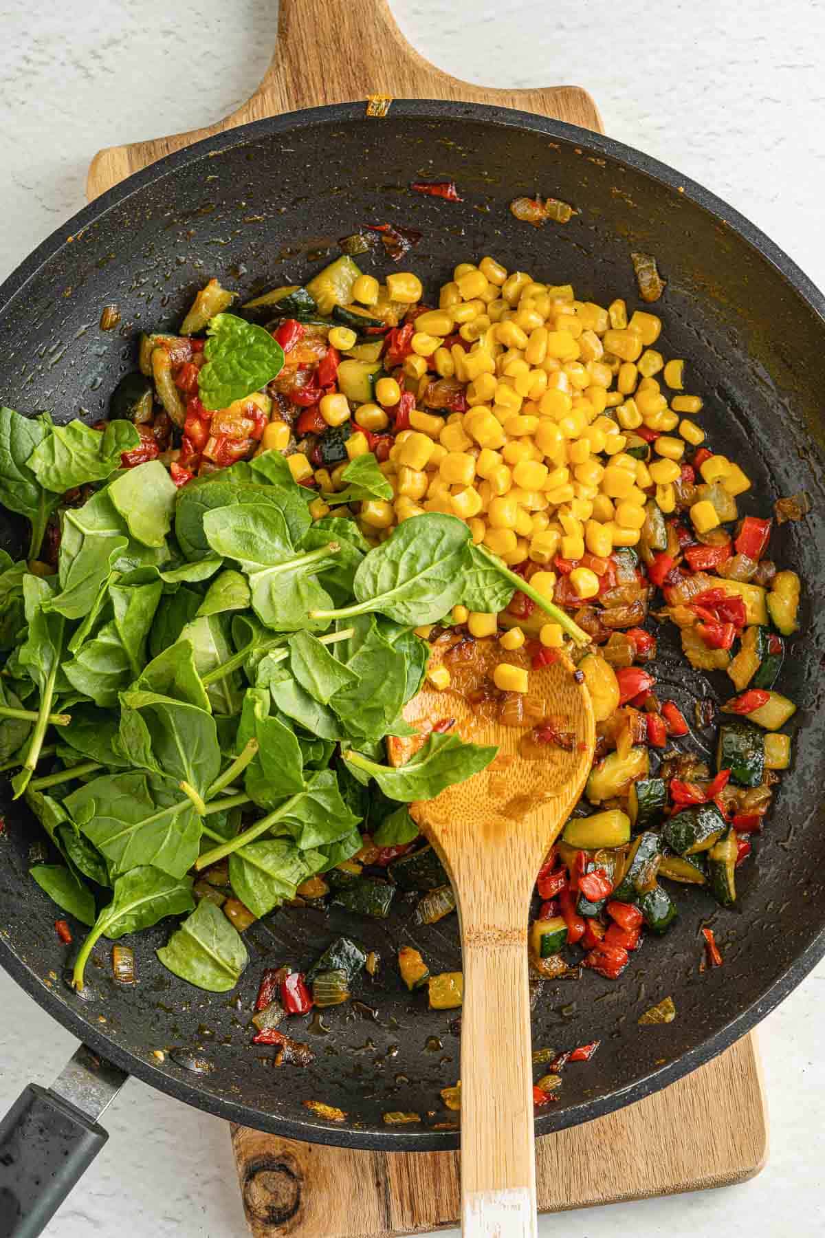 - Add diced zucchini and sauté until soft. If using Portobello stems (see notes), sauté them with the zucchini. Add the corn and fresh spinach and sauté for 2 minutes, or until the spinach wilts.